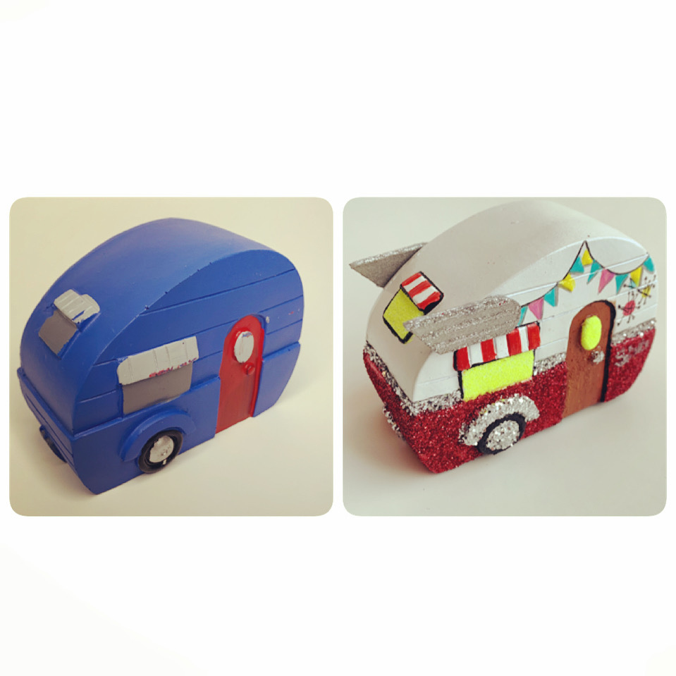 Anyway, I started by spray painting one white and one silver, and repainted the first (white) one to look like the Glitter Glamper, live on Facebook. You can check out the live replay here if you’d like to see how it went, or if you’d like to pick up your own and paint along with me! Here’s the before and after of the Glamper themed one: