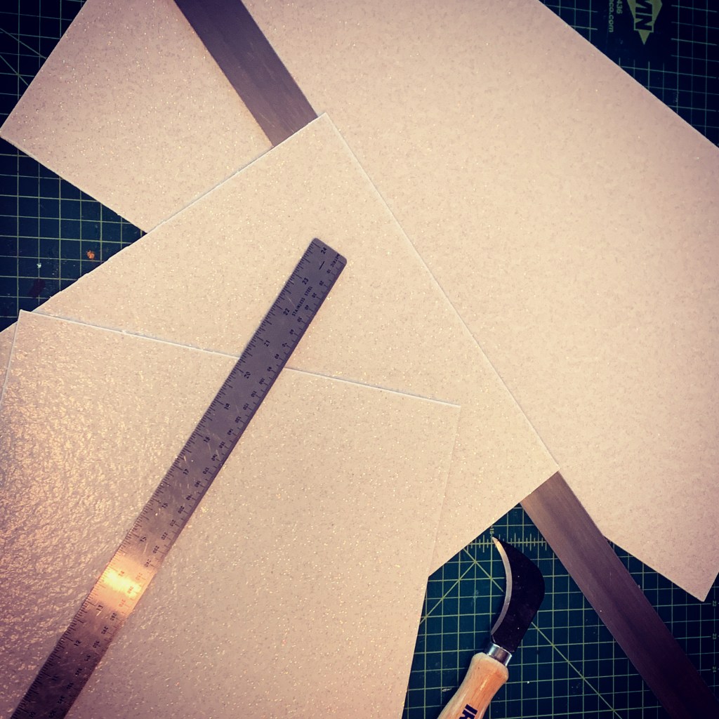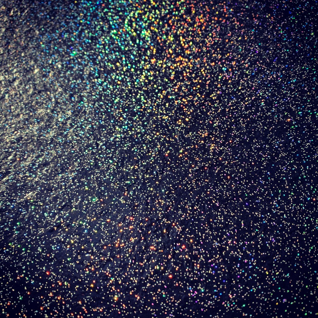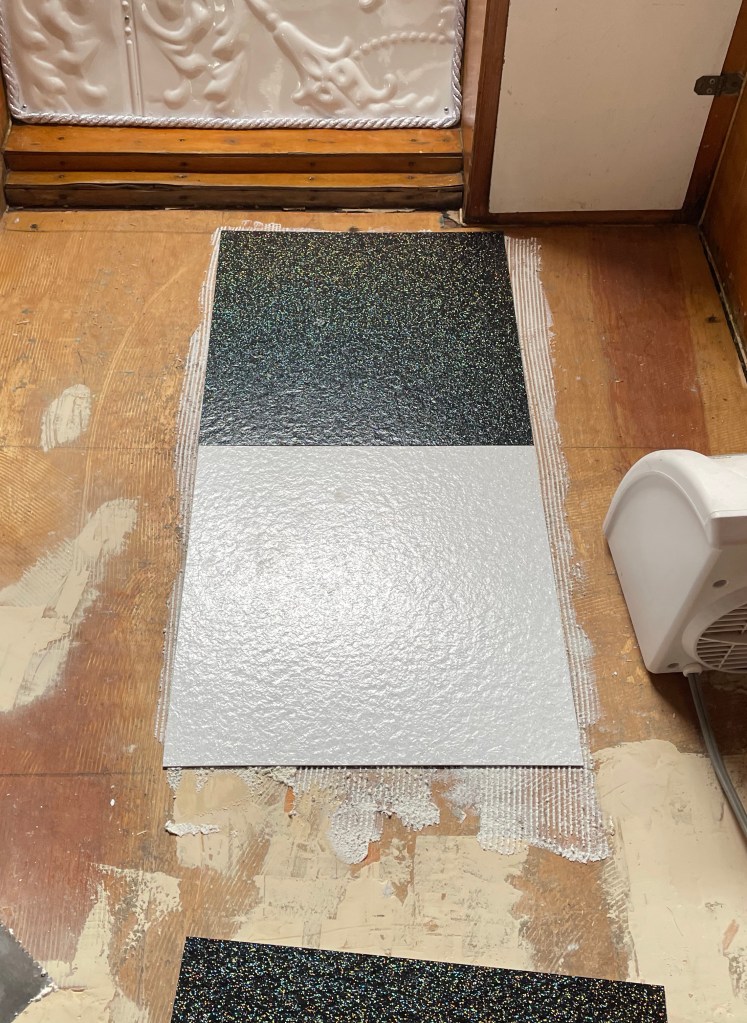 I’m SO very excited to have finally installed my new, sparkly floor in the Glitter Glamper! Just acquiring the tiles was a multi-month process of searching and ordering samples. I almost settled for one that was “kindof” glittery, with mica flecks in it…but then I finally found one that I LOVED, but they were manufactured in Canada and only for commercial customers. Luckily I was able to find a super nice sales rep right here in Minneapolis who was willing to have my tiny order shipped to their warehouse for me to pick up! (THANK YOU, Noah!!) And, even with shipping from Canada it ended up being cheaper than the one I only kindof liked.