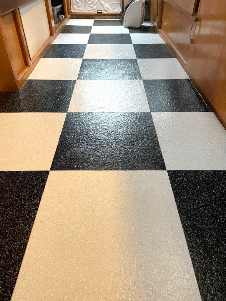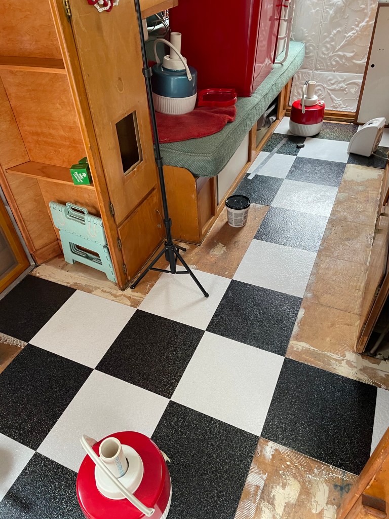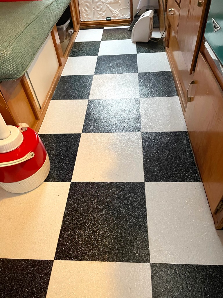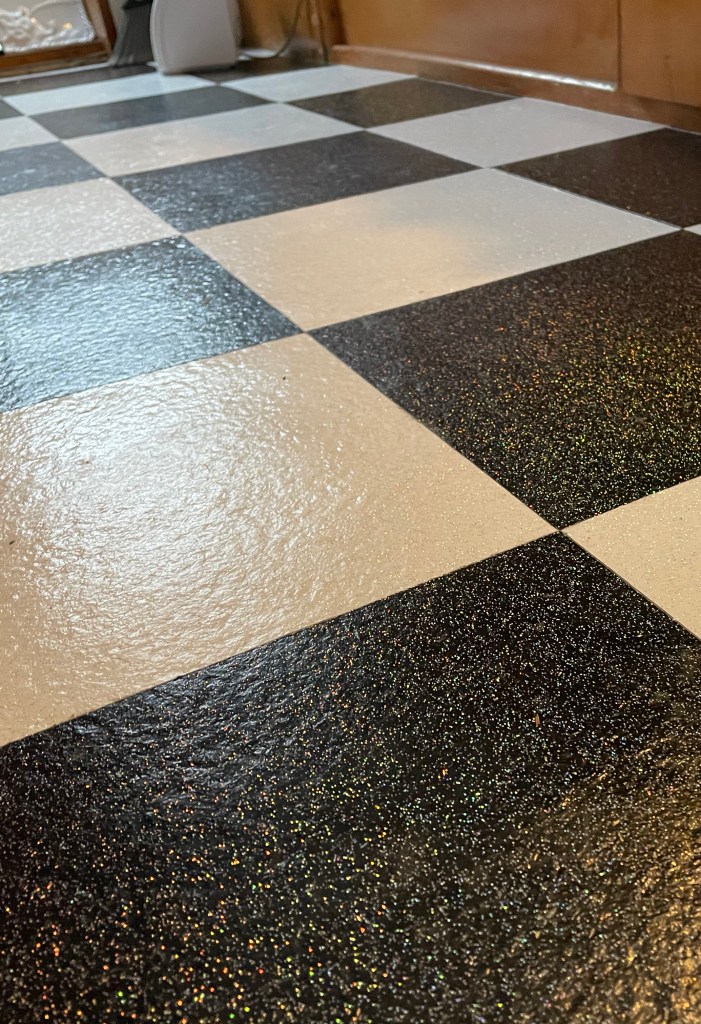 (Mark, if you’r reading this, I’m sorry you have to see this as I know you probably worked hard to put in these nice tiles!! But, being the GLITTER Glamper now, she just HAD to have sparkly, retro, black & white tiles!!) I was able to remove the tiles over two “visits” to the Glamper, around 3-4 hours of total work. I borrowed our friends’ floor scraper which really helped. The floor was of course still tacky, so it was tricky to move around!