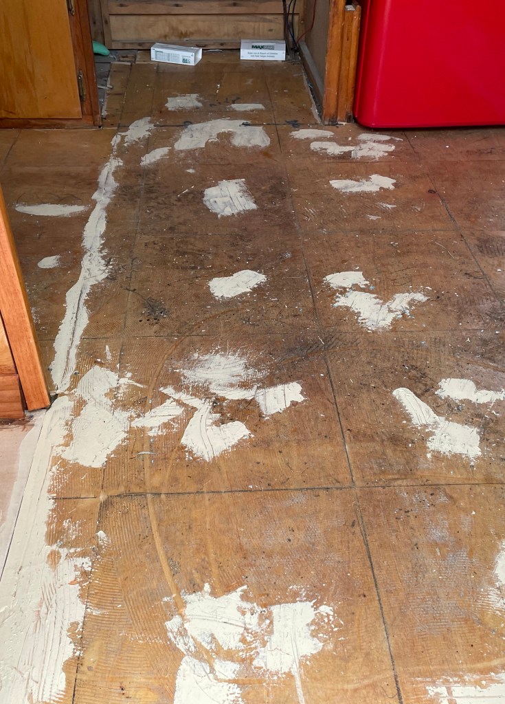 Once I got all the tiles up, I had some patching to do, as some of the tiles brought up splinters of the subfloor with them. I vacuumed it really well, and put down a couple rounds of wood filler, sanding and vacuuming again between rounds, until any little imperfections were smoothed. This was also important to cover the new seams I had created. After removing the dinette, I had to put in a new piece of subfloor, and then also had a spot to fill when I removed the furnace. So, I filled all of those cracks and crevices so I’d have a nice, consistent surface.