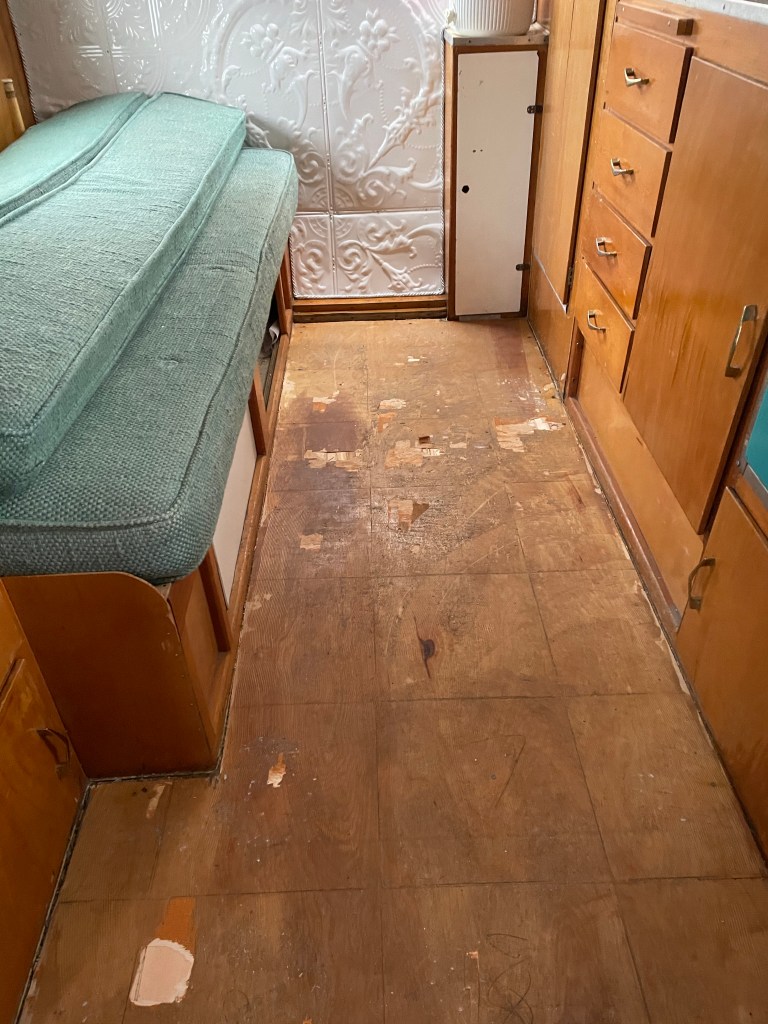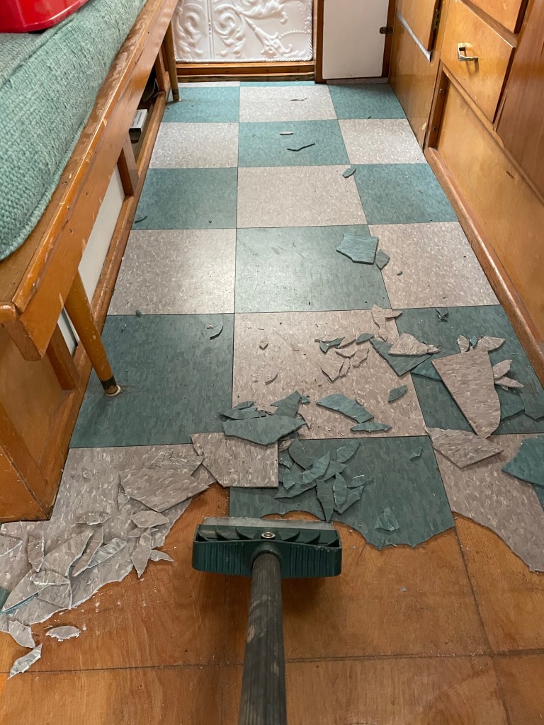 All of this was done in the dead of winter, while the Glamper was tucked away in our friends’ barn. While it was too cold to get the new floor actually in, I was still able to go work in the Glamper on a couple very chilly days with my space heater, and remove the old floor tiles. That way it would at least be ready for the new floor, just as soon as it got warm enough!