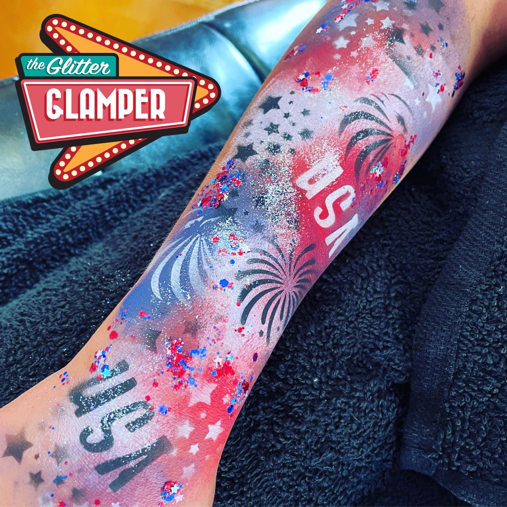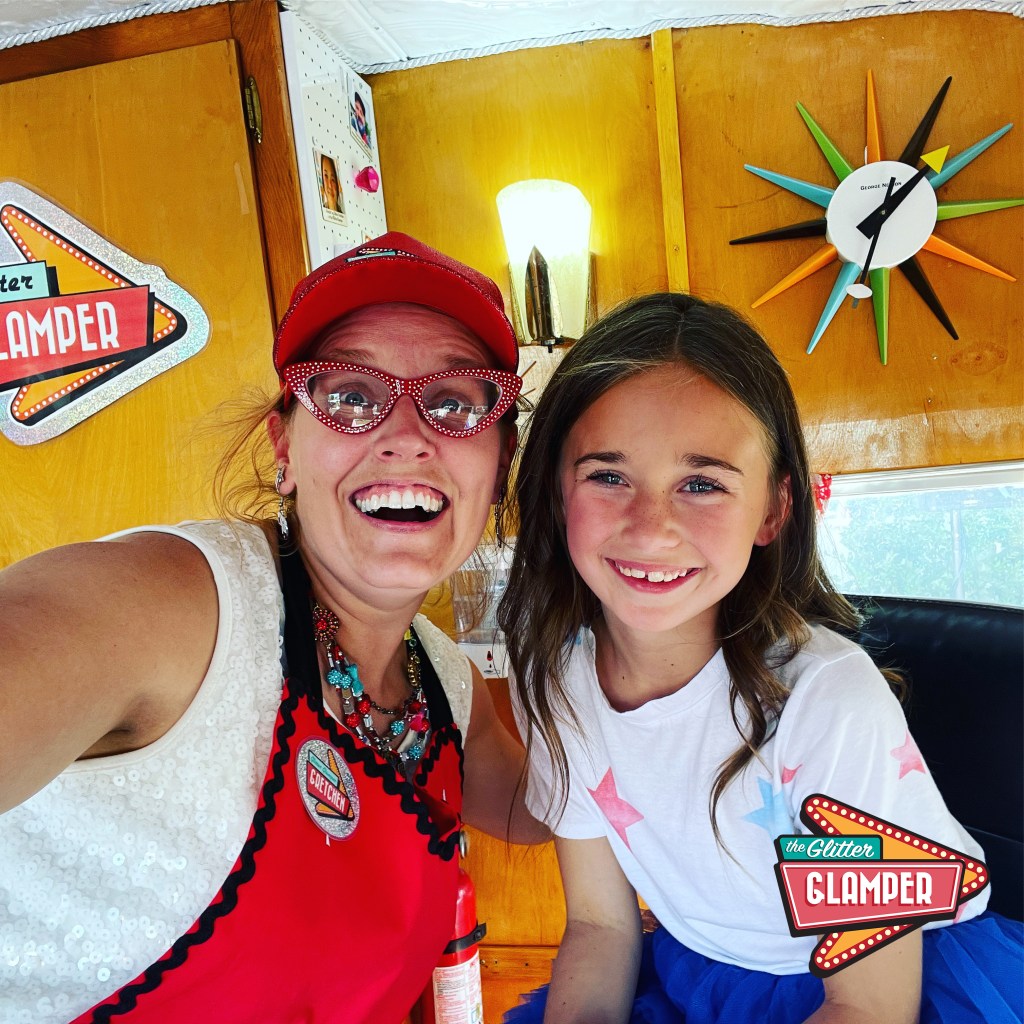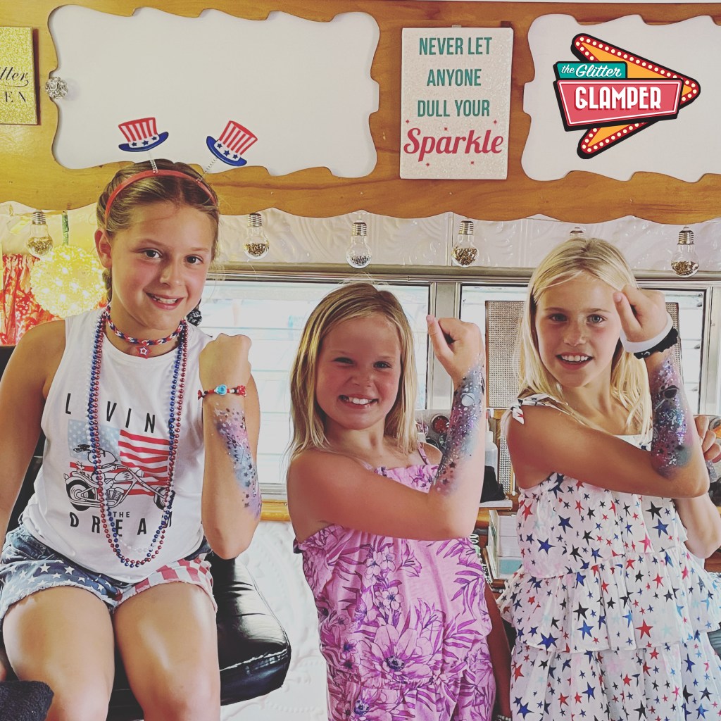 This is my FIRST ever client to be glittered up inside the Glamper!! I believe her name is Avery, and she got a patriotic glitter tattoo. I just had to get a selfie with the Glamper’s first guest!