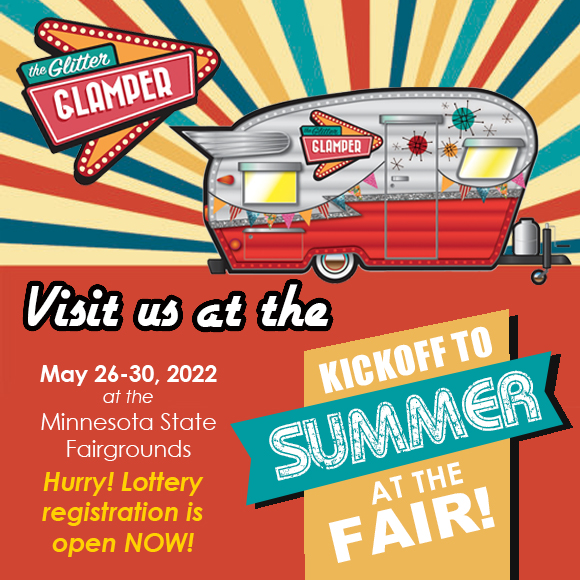 BIG NEWS! The real, live, Glamper trailer has been invited to be a part of this year’s Kickoff to Summer! Come check out the Glamper in person and get your bling on May 26-30! But HURRY! A limited number of tickets are sold via a lottery, and you have from NOW until FRIDAY to get your name in!! Click here for all the details! https://www.mnstatefair.org/kickoff-to-summer/